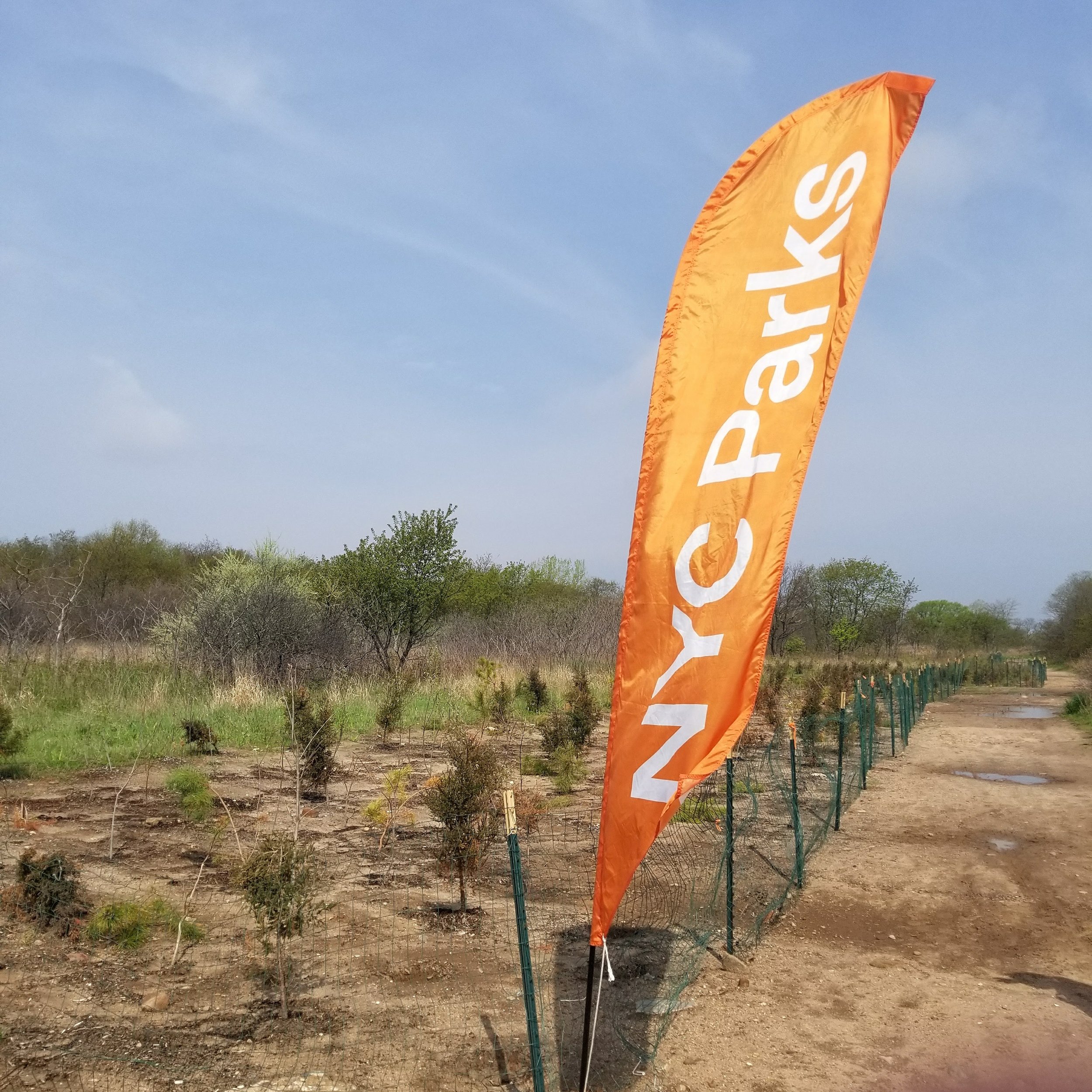 Orange flag with "NYC Parks" text in a grassy area with young trees and a path. View fullsize